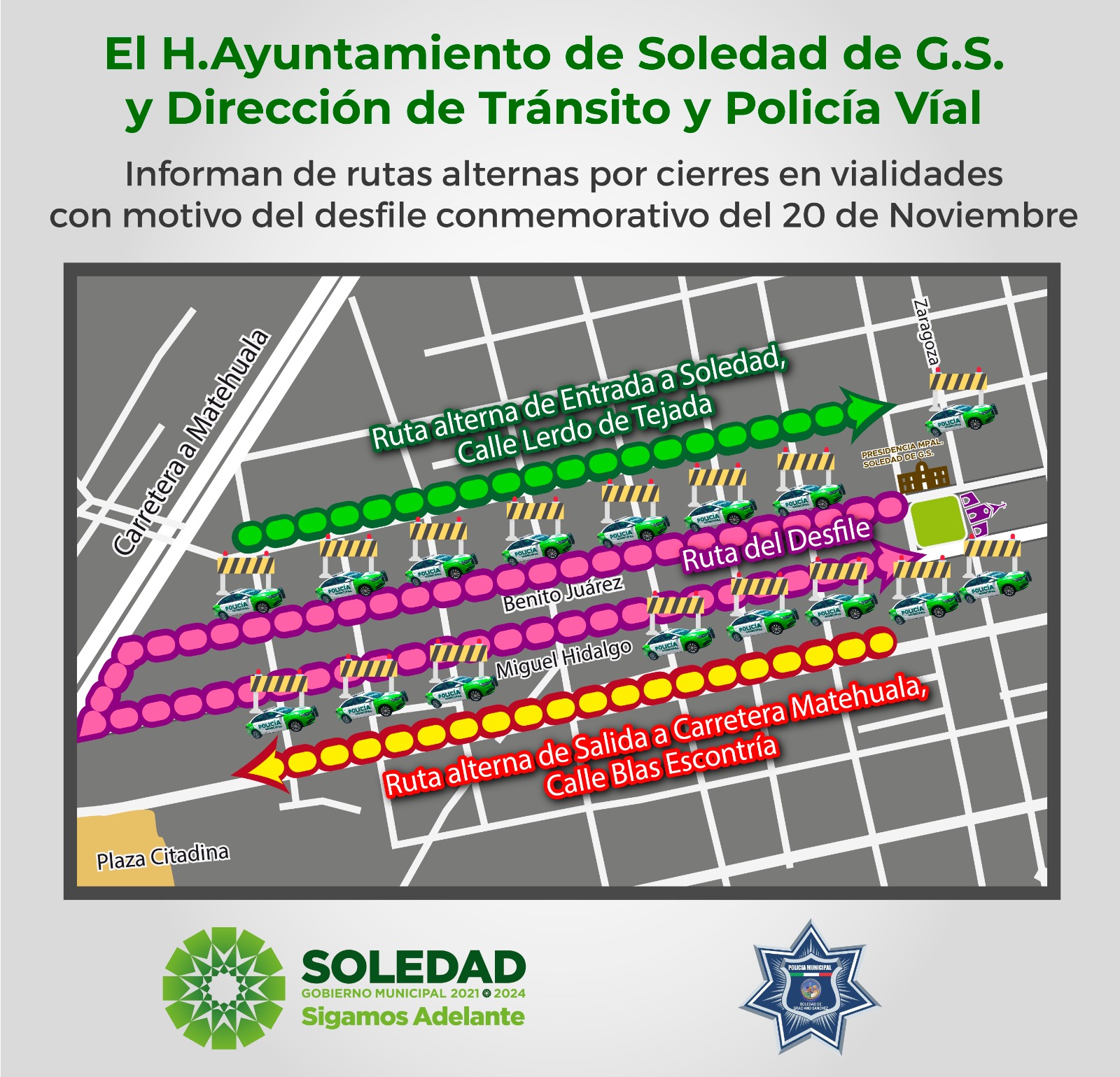 La cita es este lunes 20 de noviembre, en la Plaza principal, con un recorrido por calle Benito Juárez, lateral de Carretera a Matehuala y calle Miguel Hidalgo.