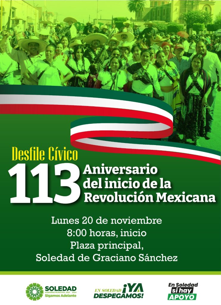 En punto de las 8:00 horas, este lunes, las calles principales de Cabecera municipal de Soledad de Graciano Sánchez lucirán de historia y tradición, al celebrarse el Desfile Cívico por el 113 aniversario del inicio de la Revolución Mexicana.