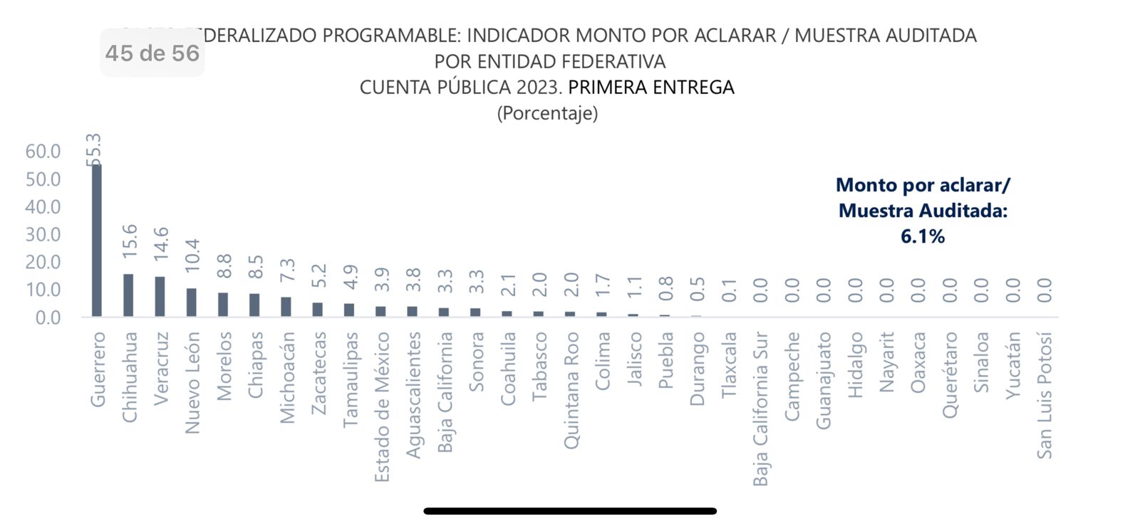 San Luis Potosí es la Entidad mejor evaluada con cero pesos observados, sin procedimientos administrativos, recomendaciones, pendientes, ni solicitudes de aclaración en los resultados de la primera revisión de la cuenta pública 2023, de acuerdo con la Auditoría Superior de la Federación de la Federación (ASF).