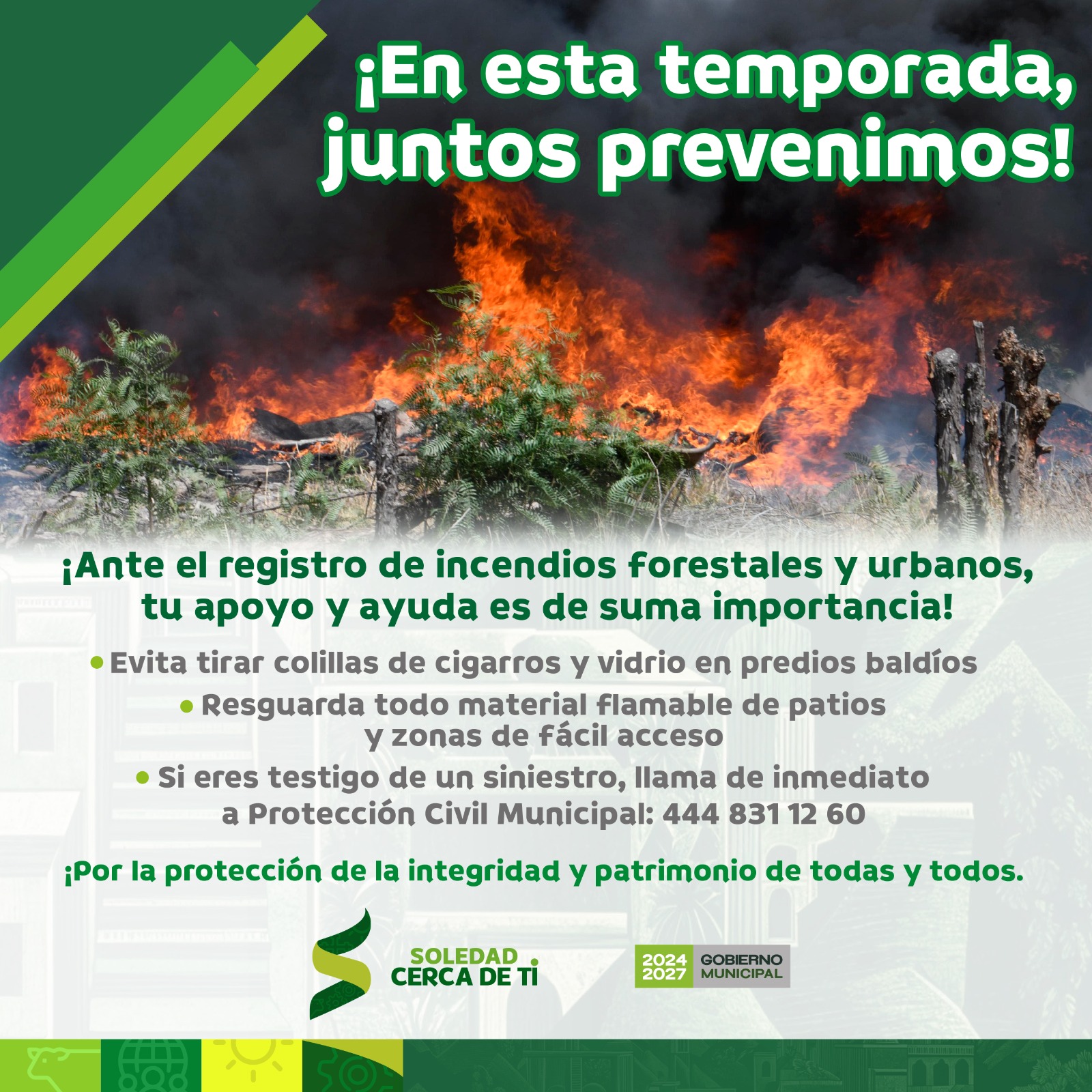 Asimismo, con el propósito de reforzar la cultura de la prevención, exhortó a la ciudadanía a evitar conductas de riesgo como tirar colillas de cigarro o vidrios en predios baldíos, así como a mantener resguardado todo material inflamable en patios y zonas de fácil acceso; además de recordar a la población que en caso de presenciar un siniestro, debe comunicarse de inmediato al número de Protección Civil Municipal: 444 831 12 60 para proteger la integridad y el patrimonio de todas y todos.