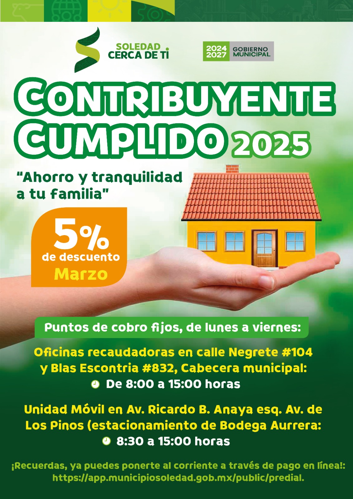 El Ayuntamiento de Soledad de Graciano Sánchez recuerda a la ciudadanía que quedan pocos días para aprovechar el 5 por ciento de descuento en el pago del impuesto predial, beneficio que estará vigente hasta el 31 de marzo como parte del programa Contribuyente Cumplido 2025.