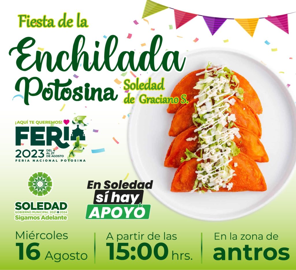 Todo está listo para que el día de mañana, miércoles 16 de agosto, se realice La Fiesta de la Enchilada Potosina en la Feria Nacional Potosina (FENAPO) 2023, evento organizado por el Ayuntamiento de Soledad, con apoyo del Gobierno del Estado, y en el que se presentará una edición de la Lotería Nacional con la imagen de este emblemático platillo que ha dado identidad culinaria a las y los potosinos.