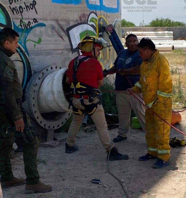 Elementos del cuerpo de Bomberos Metropolitanos  y Guardia Civil Estatal rescataron a una persona que estaba atrapado en el interior de un enorme tubo.